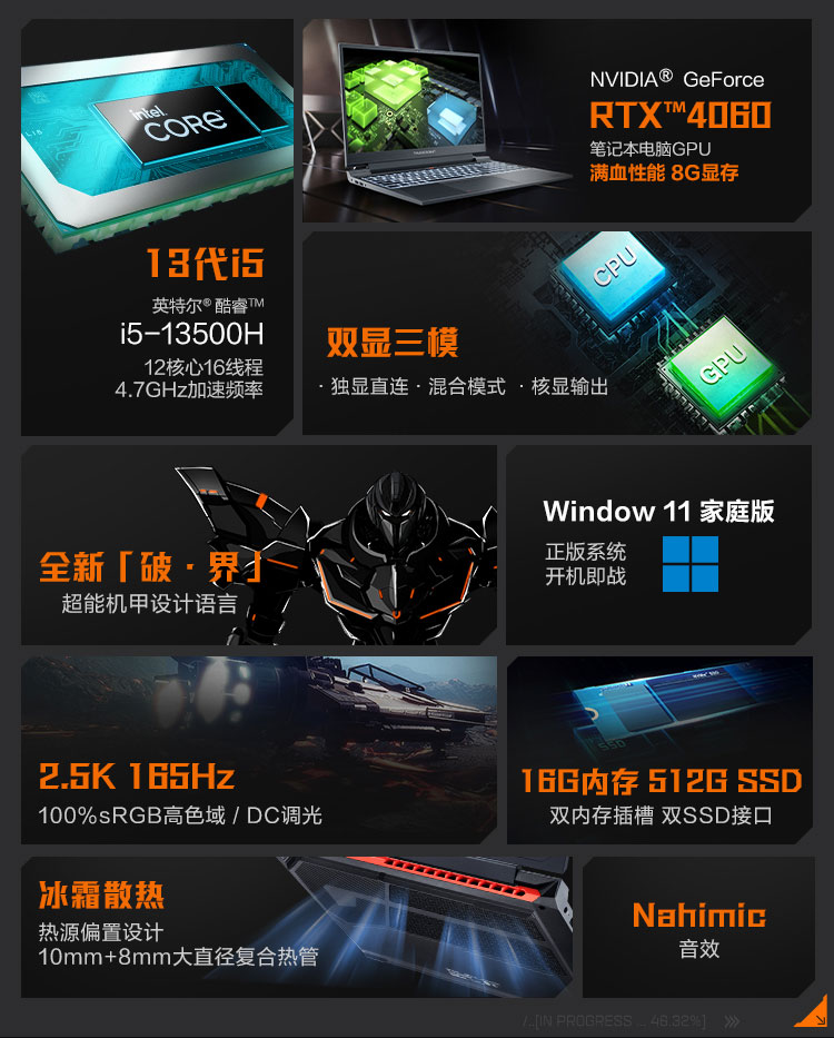 详细参数 品牌:雷神(THUNDEROBOT) 系列:雷神(THUNDEROBOT) 911pro 型号:雷神(THUNDEROBOT) 911pro 产品定位:家庭办公,影音娱乐,游戏高端,学生用机,轻薄便携,性价比机,绘图建模,游戏发烧 操作系统:Windows10 游戏性能:发烧级 CPU类型:Intel i7 CPU型号:i7-11800H 核心数:八核心 CPU平台:Intel 内存类型:DDR4 最大支持内存:64GB 插槽数量:2个 内存容量:16GB 硬盘容量:1TB 硬盘类型:固态硬盘 显卡类型:高性能游戏独立显卡 显存容量:8GB 显卡型号:RTX3070 光驱类型:无光驱 屏幕尺寸:15.6英寸 屏幕比例:16:9 屏幕分辨率:1920×1080 屏幕类型:IPS 触摸功能:不支持 蓝牙功能:支持 局域网:10/100/1000Mbps 无线局域网:802.11ac USB2.0端口:0个 USB3.0端口:无 USB3.1端口:2个 视频端口:HDMI 音频端口:耳机/麦克风二合一接口 读卡器类型:SD读卡器 RJ45网络接口:1个 TypeC 3.1:1个 内置摄像头:支持 内置扬声器:支持 内置麦克风:支持 指取设备:触摸板 电池类型:锂电池 电源适配器:官网为准 续航时间:小于5小时 机身尺寸:361(W)×246(D)×21(H)毫米 净重:2.5千克 颜色:黑色 厂商保修政策:全国联保 CCC认证编号:201901090123654 生产者(制造商)名称:青岛雷神科技股份有限公司