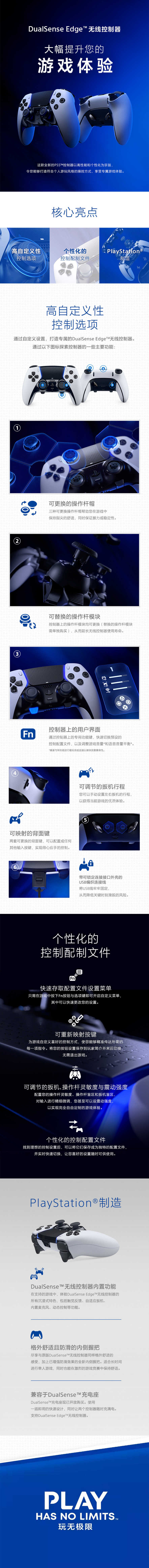 主体 品牌PlayStation 产品类型手柄 型号PlayStation 5 无线游戏手柄 【Edge国行精英手柄】 材质以官网为准 颜色混色 上市时间(月)2023-01 规格参数 即插即用支持 连接方式无线 尺寸(长×宽×高)190*190*70毫米 净重量(不含外包装)420克