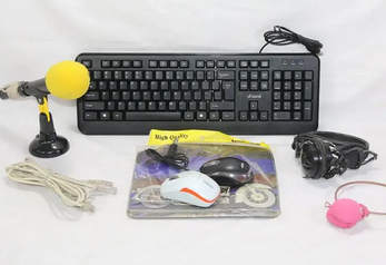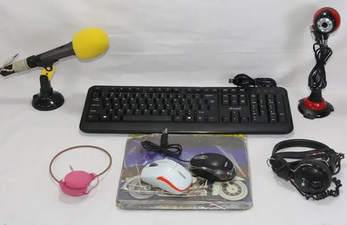 方正USB有线键盘、雷柏无线光电鼠标、闲置未用鼠标垫、日本东芝桌面话筒、闲置两条制式网线、头戴式耳麦+立体声耳机,免费赠送两用摄像头,品相如图实物拍摄完好无损;包邮不议价。
